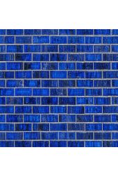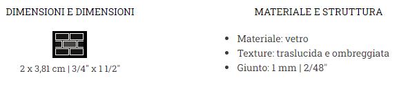 Tessere di mosaico in vetro fuso semitrasparente, arricchite con smalti scintillanti e pietra aventurina. La miscelazione dei due colori del vetro permette di ottenere il classico effetto venato sulla superficie. L'Aventurina è una pietra artificiale prodotta dalla fusione, a ca. 1200°C, di sabbia silicea, rame e componenti coloranti.