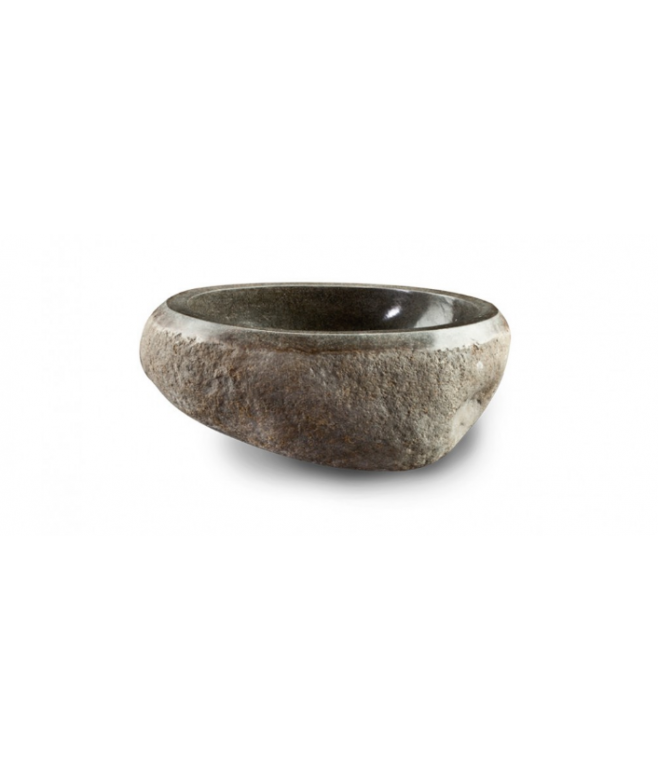 Lavabo d'appoggio in Pietra di Fiume nelle dimensioni diametro 35 cm colore Grigia scura lavorata artigianalmente, lasciando intatta la forma che l'acqua le ha dato nei secoli. Colori che virano dal grigio con sfumature nocciola all'antracite con riflessi ambra. Lucidata all'interno e sul bordo, è volutamente lasciata al naturale esternamente a memoria della materia originale. Ogni pezzo della collezione é unico e non ripetibile in serie.