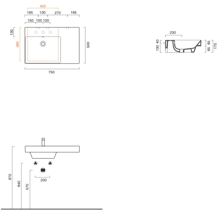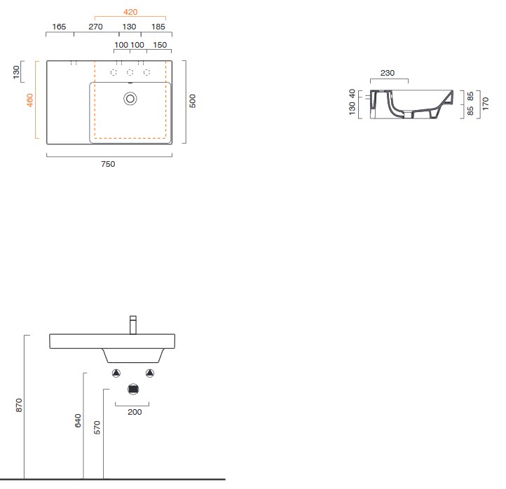 Lavabo per installazione sospesa, semincasso o su mobile.